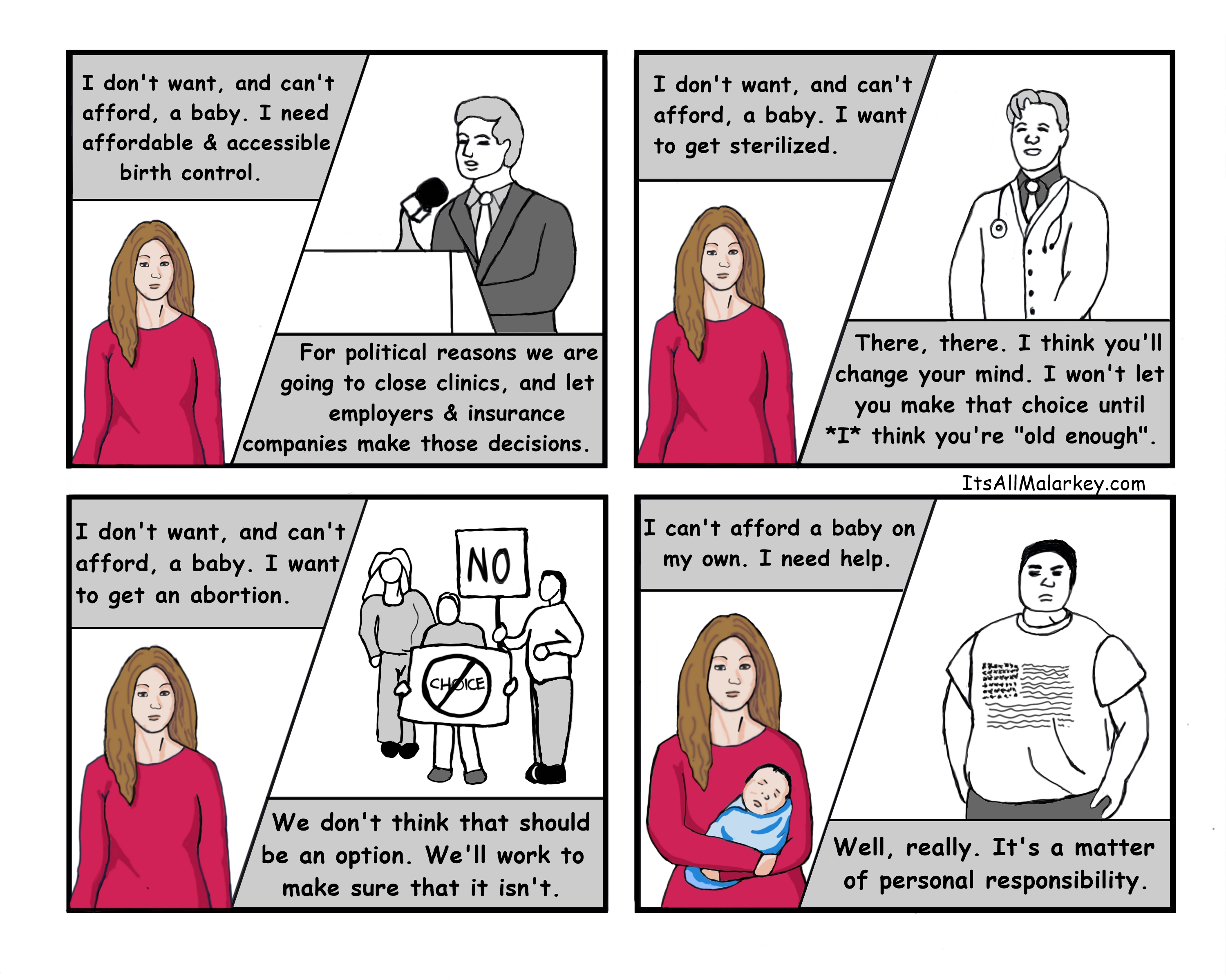 My brain breaks down at all the people who feel that because their opinion is the “one, true, and right way”, that they should get to determine the choices and options available for other people, while at the same time denying they have any responsibility for the outcomes that result from those choices  and options. I have a problem, no matter what the topic of discussion, with anyone who says ”I am right, this is the way it shall be, but YOU have to deal with all the consequences–I’m blameless”. That isn’t how the concept of “personal responsibility” works.