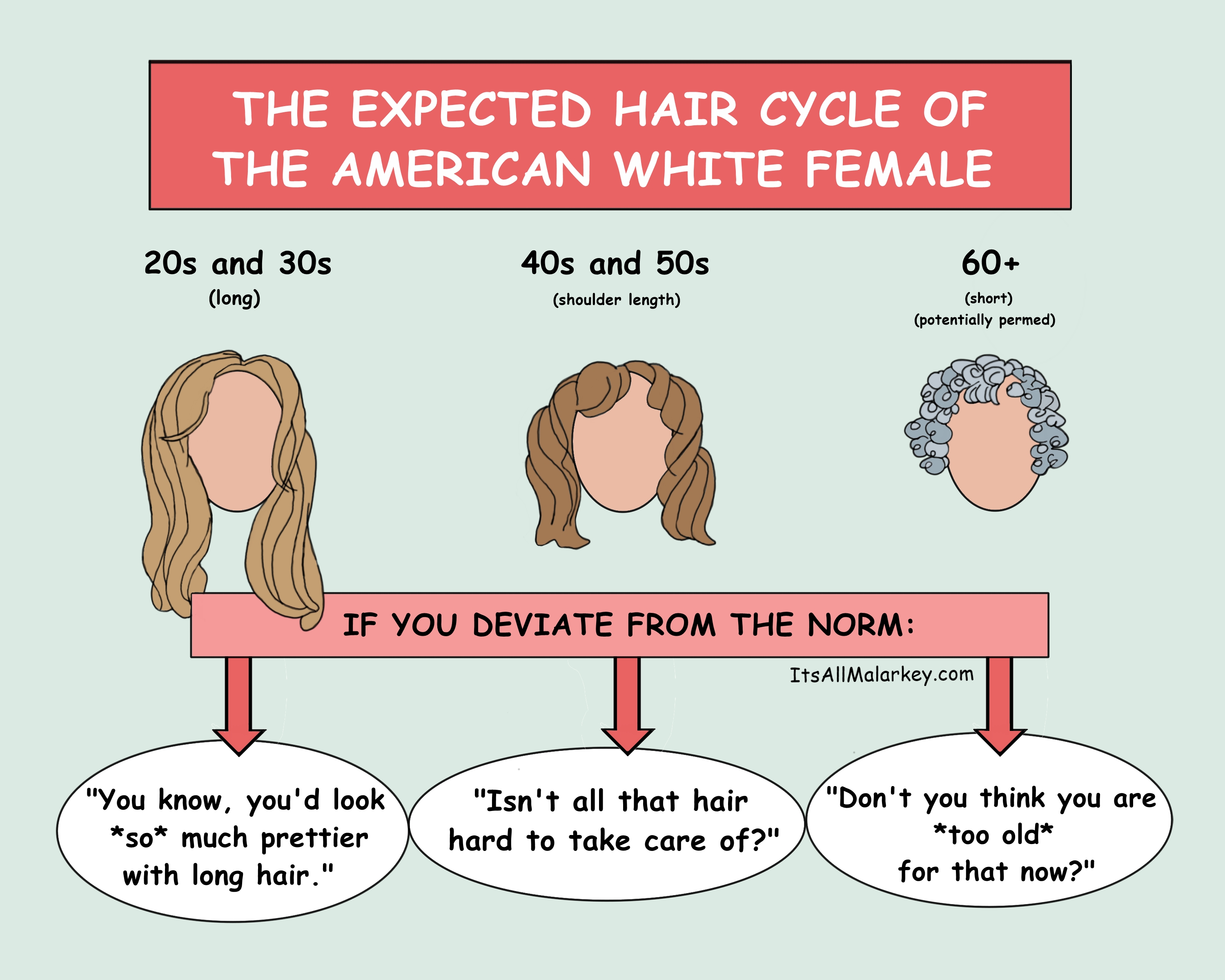 If the accounts of my various girl friends are any indication, this is the only acceptable timeline for hair styles (my friends of color tend to have different experiences, including strangers who touch their hair without permission. What kind of people think doing that is okay?!?). Women who dare to wear their hair long after their 20s are continually pressured to cut it, while women in their 20s are pressured the opposite direction. A young woman I know with short hair who used to work retail has had multiple people refuse to let her wait on them in the store because of her short hair. Really? Really? I, myself, have never noticed hair length impacting how helpful or unhelpful a person was. Personally, I think it is more intense for her because she is simply so very gorgeous–so it is doubly grating to some people.