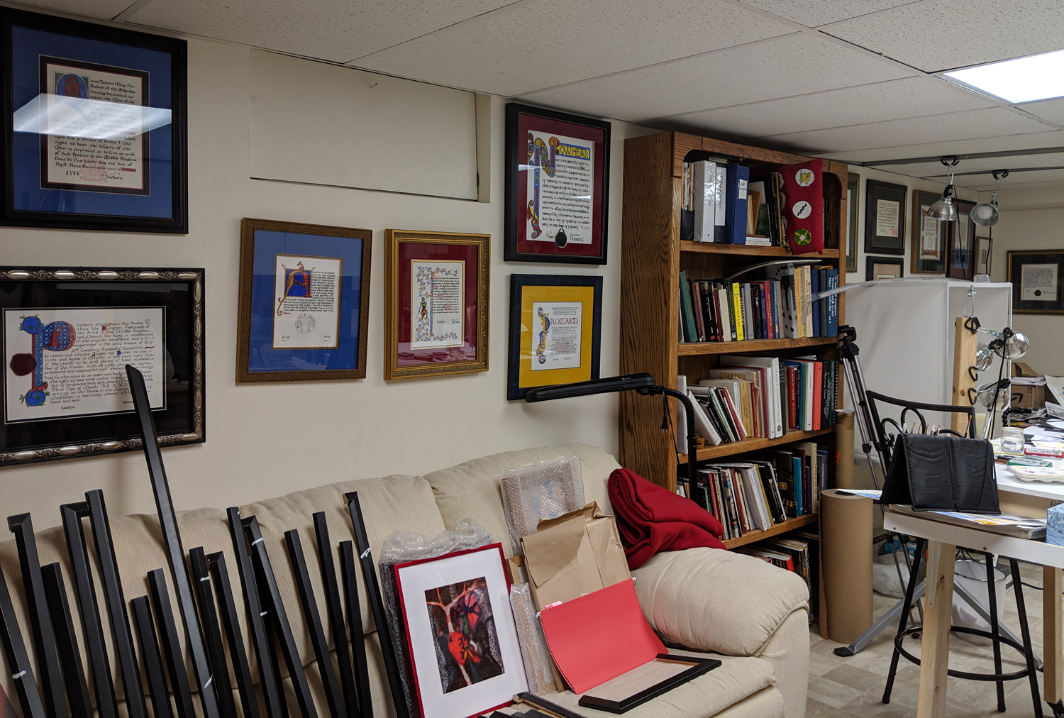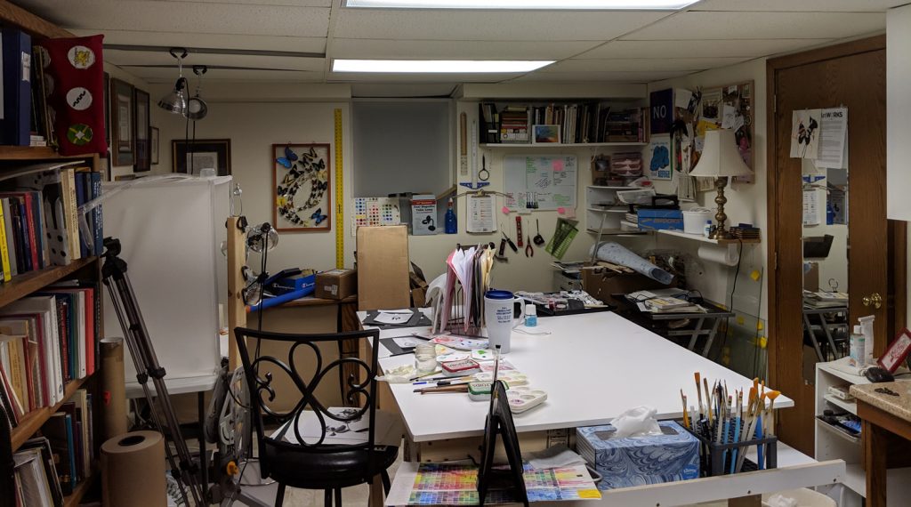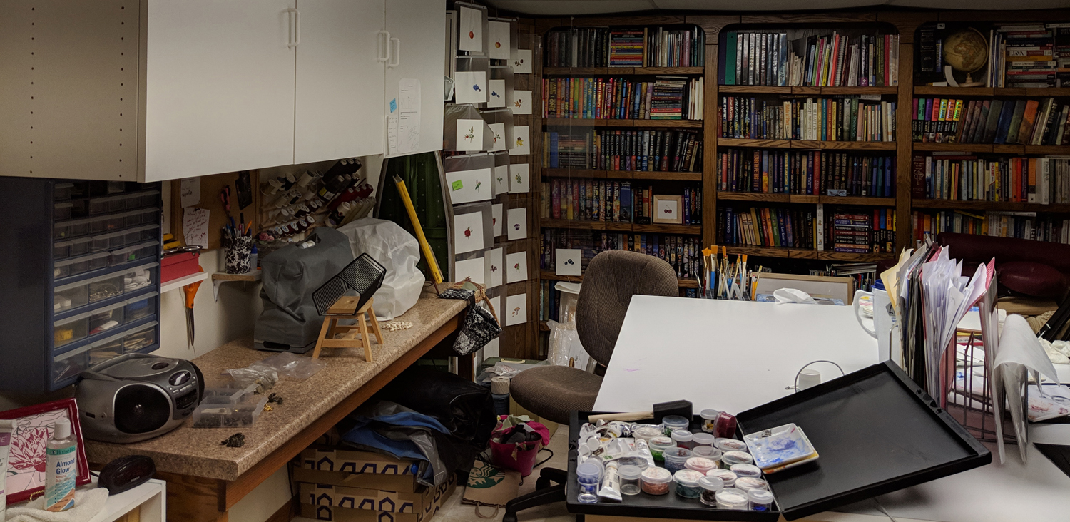 Since I lost my brand-new studio, I spent a large chunk of last month moving and organizing and re-arranging things. Rather than try to find a new outside location, I have been trying to fit myself into one of the rooms of my house. Notice there isn’t a lot of available wall space left! I haven’t quite used every available inch, but I am getting close.