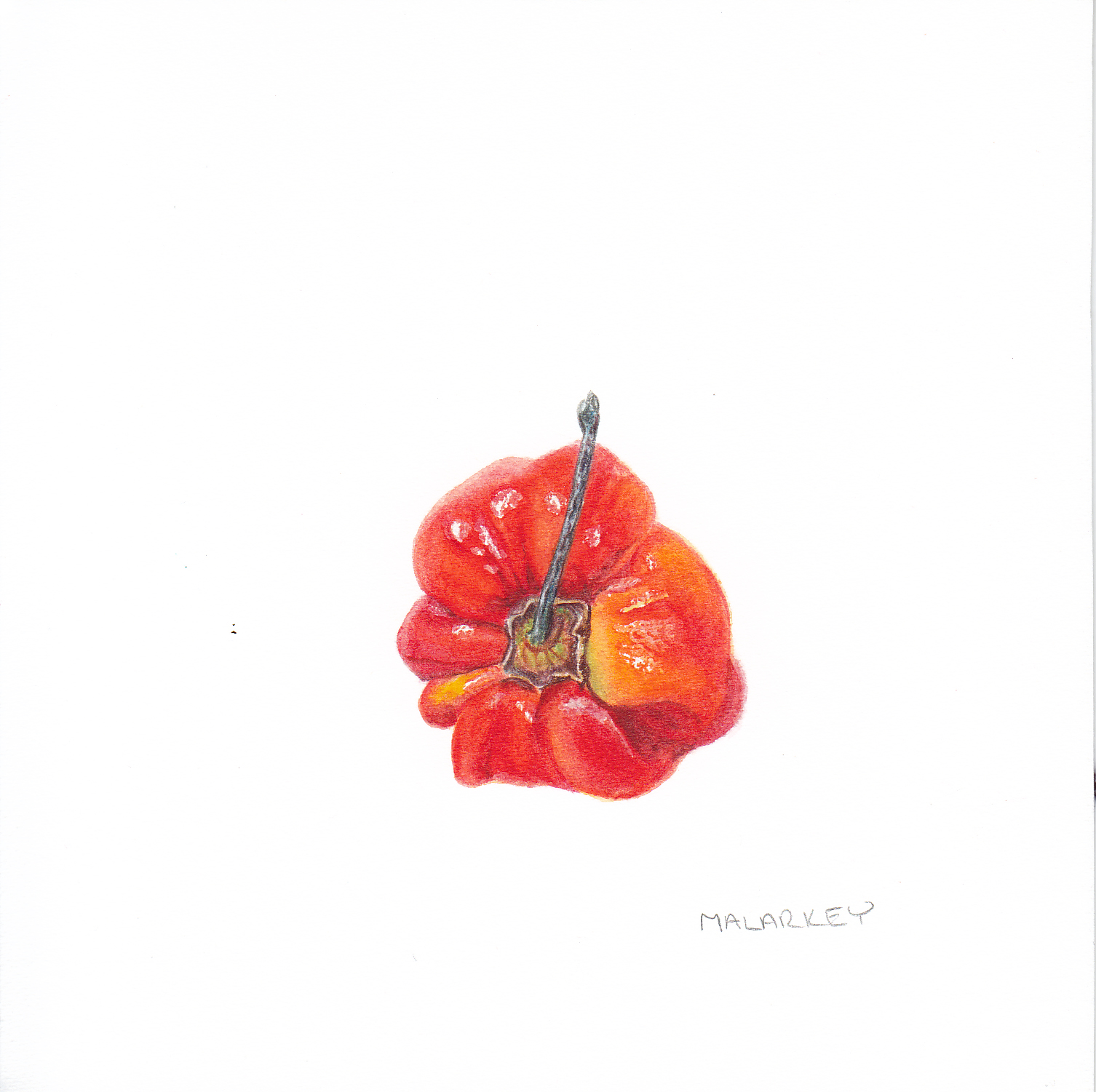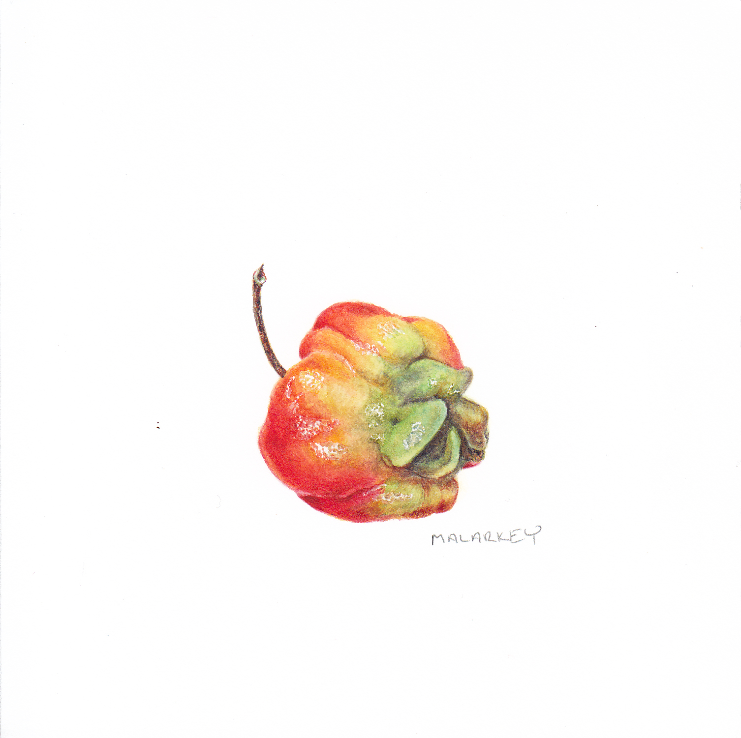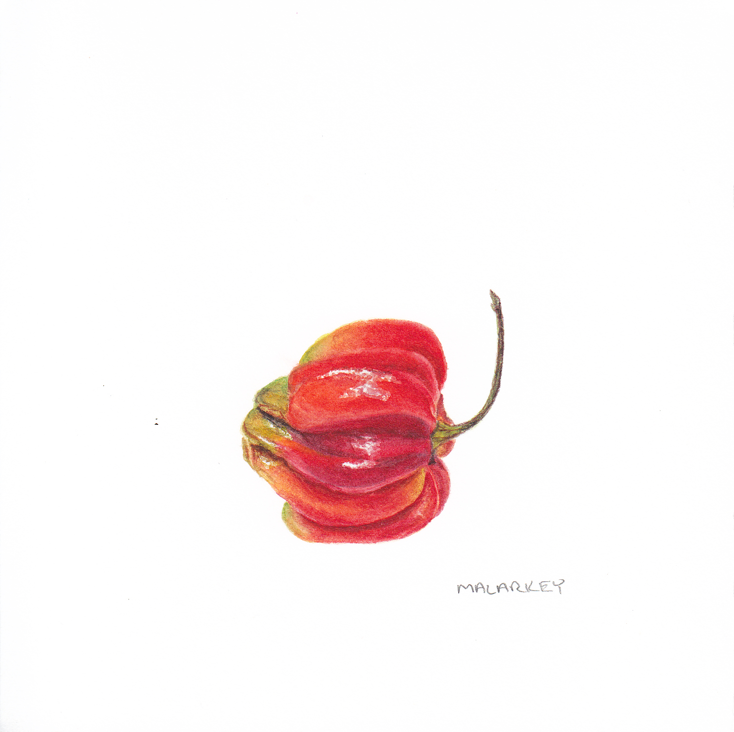 In other cases, I just fell in love with a specimen. This habanero, for example? I spent a half hour in the Asian Market going through the habanero box, until I found this one habanero that spoke to me. And I loved it so much, I did three paintings of it from different angles.