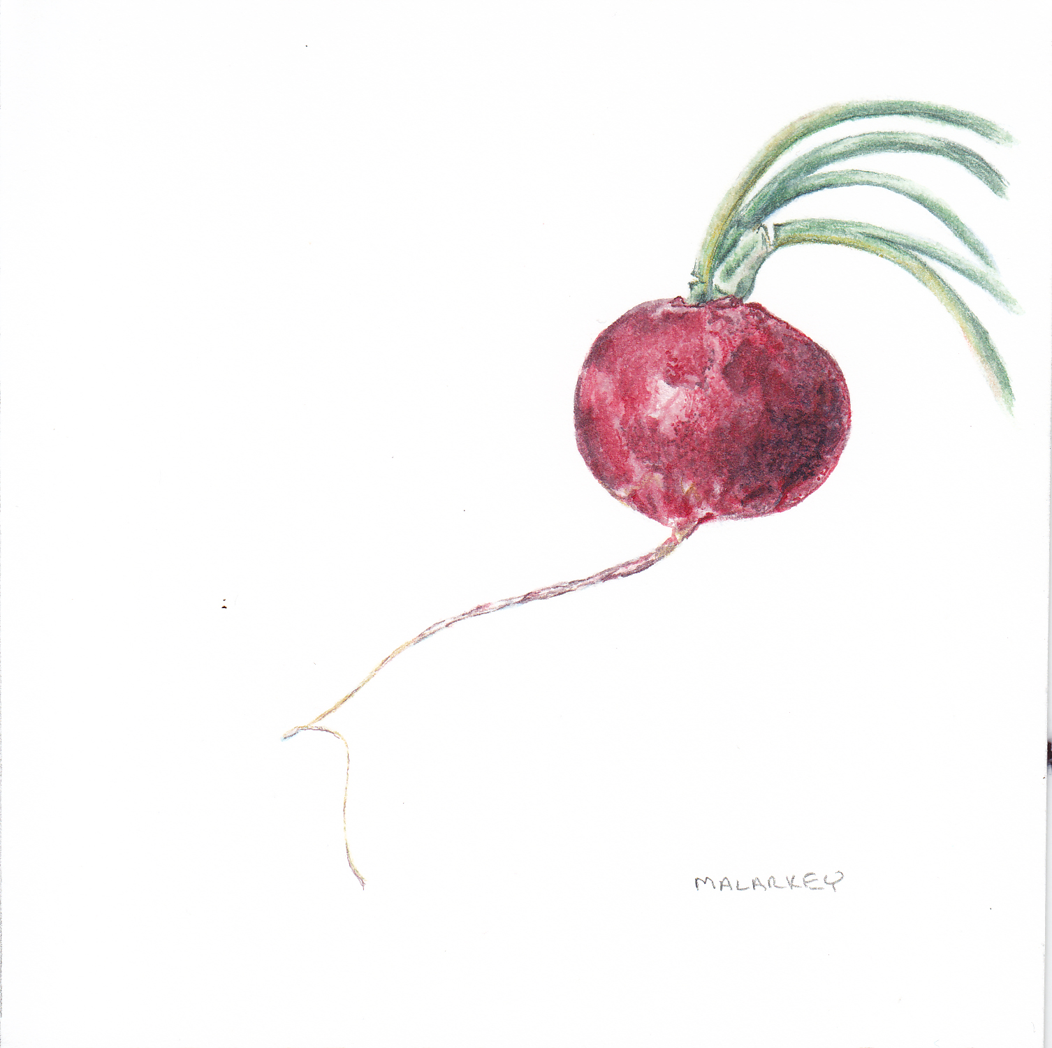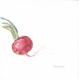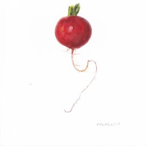I am scheduling this to post while I am at the CSA party handing them out, so hopefully my next post will report that they were well received. And I will share a few more images with you. But for now, this post has gotten really long, and I have a lot more paintings to share, so I will just add these three. I got excited about radishes, because I love their twisty little tail/roots. Also, I think these three show how different things can be. The first two radishes came from the same batch, and were similar in color. The third came from a different batch, and is very different in color. Techniques were different to suit the specimen, but isn’t it amazing how much variation there is? Talk about a visual.