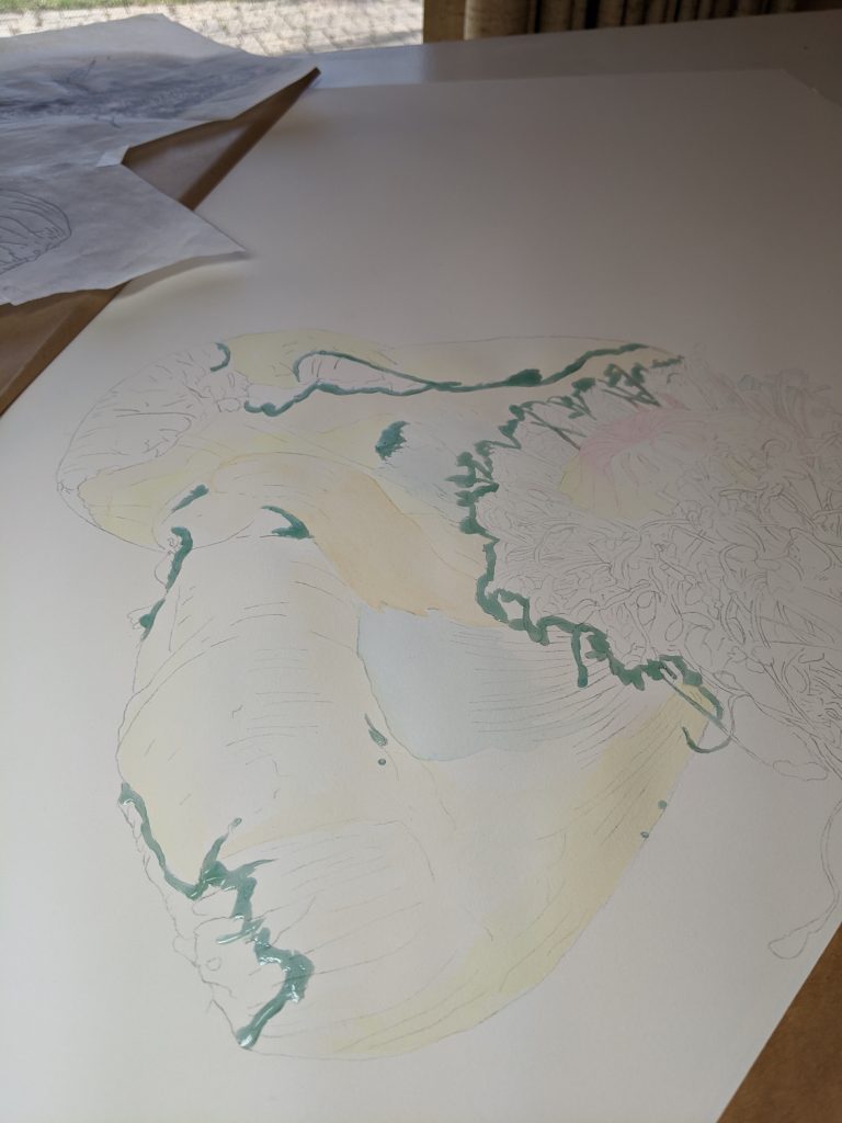 In other news, the quiet from my direction may look like I am not doing anything. Which isn’t precisely true, but neither have I had enough for a full blog post. Unfortunately, the busiest time to be out collecting samples for nature creative endeavors for the rest of the year is also construction season. As we are still working on the foundation construction that means a good deal of the time there is dirt under my fingernails, which is contraindicated for painting. Then the air conditioner died, which then had to be removed, then the wall repaired, then painted…you know how projects go…which is –of course–my main work area. Productivity has been at a low ebb.