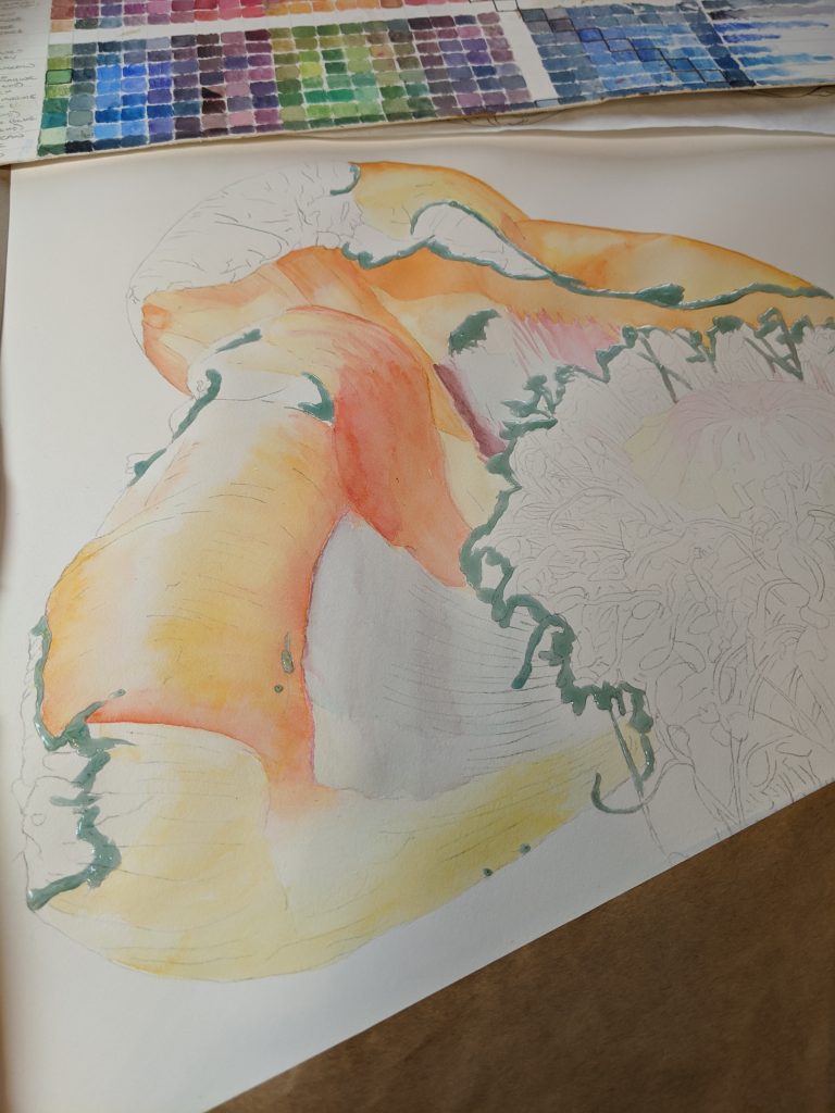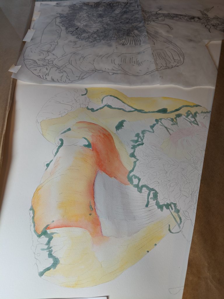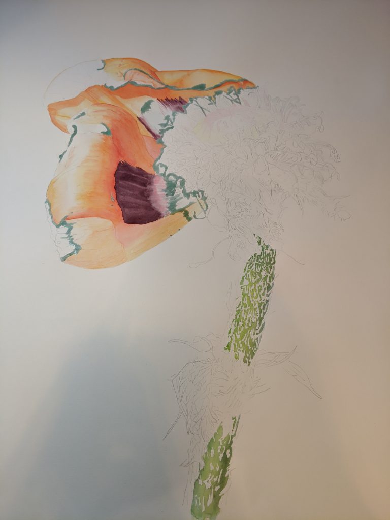 And I have been working on my large botanical, which is really beyond my skill level, so it is SLOW going. But here are a few in “process photos”: